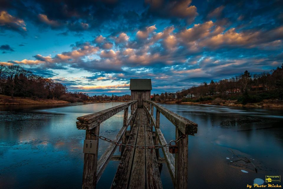 Der Kranicher Teich war zwar schon zugefroren, dennoch spiegelte sich der großartige Wolkenhimmel im Teich wider. Mein Interesse weckte auch das Striegelhaus im Teich.