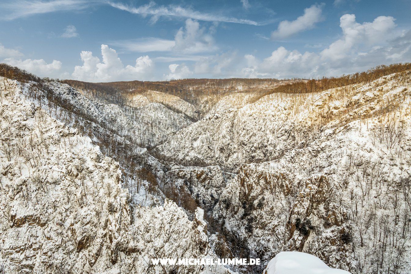 Am Morgen des 17. Januar bin ich nach Thale gefahren, um einen morgendlichen Spaziergang zur Roßtrappe zu unternehmen. Noch vor dem Sonnenaufgang bin ich losgefahren, um in Ruhe zur Roßtrappe zu wandern. In Thale angekommen erwartete mich eine wunderbare Winterlandschaft, über dem Hexentanzplatz ging gerade die Sonne auf und ich konnte ganz in Ruhe zur Roßtrappe wandern. Ich finde den Blick vom Hexentanzplatz oder wie heute von der Roßtrappe ins Bodetal immer wieder beeindruckend und faszinierend. Die steilen Hänge mit den schroffen Felsen, machen das Bodetal zu einem ganz besonderen Ort im Harz. So lange jetzt noch, dass Bodetal mit Schnee bedeckt ist, wollte ich unbedingt den Blick von der Roßtrappe ins Bodetal genießen. Es war ein wirklich wunderschöner Ausflug am Sonntagmorgen.