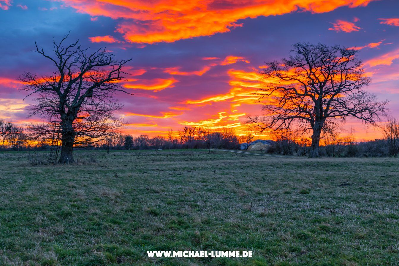 Auf meinen Touren habe ich auch stets eine Kamera dabei, um das ein oder andere Motiv einfangen zu können und damit mir schöne Momente nicht entgehen. An diesem Morgen habe ich auf einen schönen Sonnenaufgang gehofft. Deswegen führte mich meine Tour zu zwei alten Bäumen in der Nähe von Stapelburg, denn mich faszinieren alte Bäume sehr. Gerade rechtzeitig an den Bäumen angekommen zeigte sich ein wunderschönes Morgenrot. Ein wirklich wunderschöner Moment, da störte es auch überhaupt nicht das es stürmisch gewesen ist. Zum Sonnenaufgang verschwand die Sonne hinter den Wolken, aber das wunderschöne Morgenrot entschädigte mich dafür. Es ist jedes Mal eine große Freude einen solchen Moment miterleben zu dürfen und auch noch fotografieren zu dürfen.