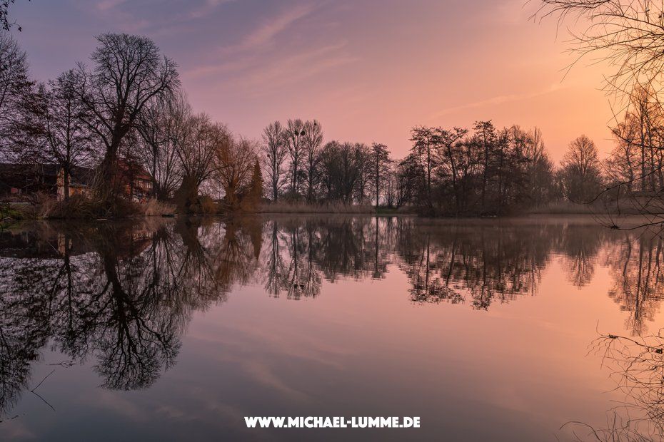 Am Donnerstag den 25. März kam ich am Morgen beruflich nach Flachstöckheim. Ich kam gerade rechtzeitig zum Sonnenaufgang. Ich liebe die Stimmung und die Farben bei Sonnenauf- und Sonnenuntergängen sehr, deswegen faszinieren und begeistern sie mich immer wieder. Am Mühlteich am Ortseingang von Flachstöckheim (ich bin nicht von hier und weiß deshalb nicht genau ob er wirklich Mühlteich heißt!) ging gerade die Sonne auf, deswegen musste ich einen kurzen Stopp am Teich einlegen. Ich konnte zwar leider nicht die Sonne fotografieren, weil Äste und Gestrüpp den freien Blick darauf nicht zuließen, aber die Spiegelung in dem ruhigen Mühlteich war wunderschön. Mit der wunderschönen Lichtstimmung zum Sonnenaufgang war es ein sehr schönes Fotomotiv.