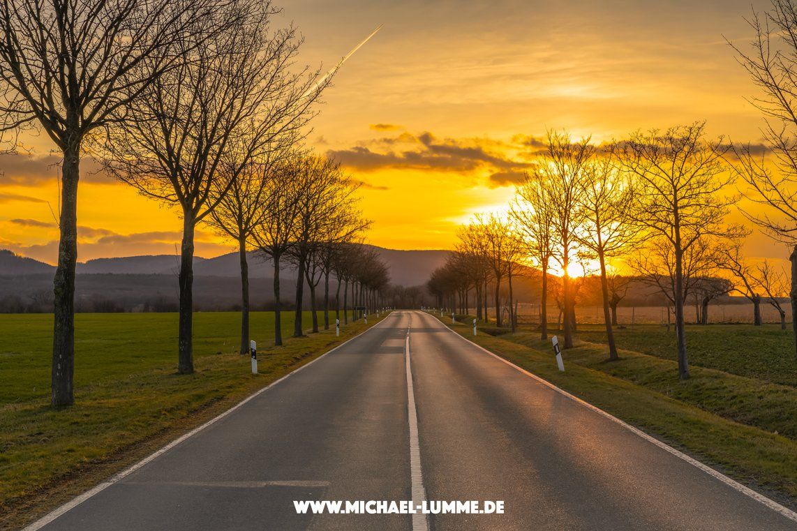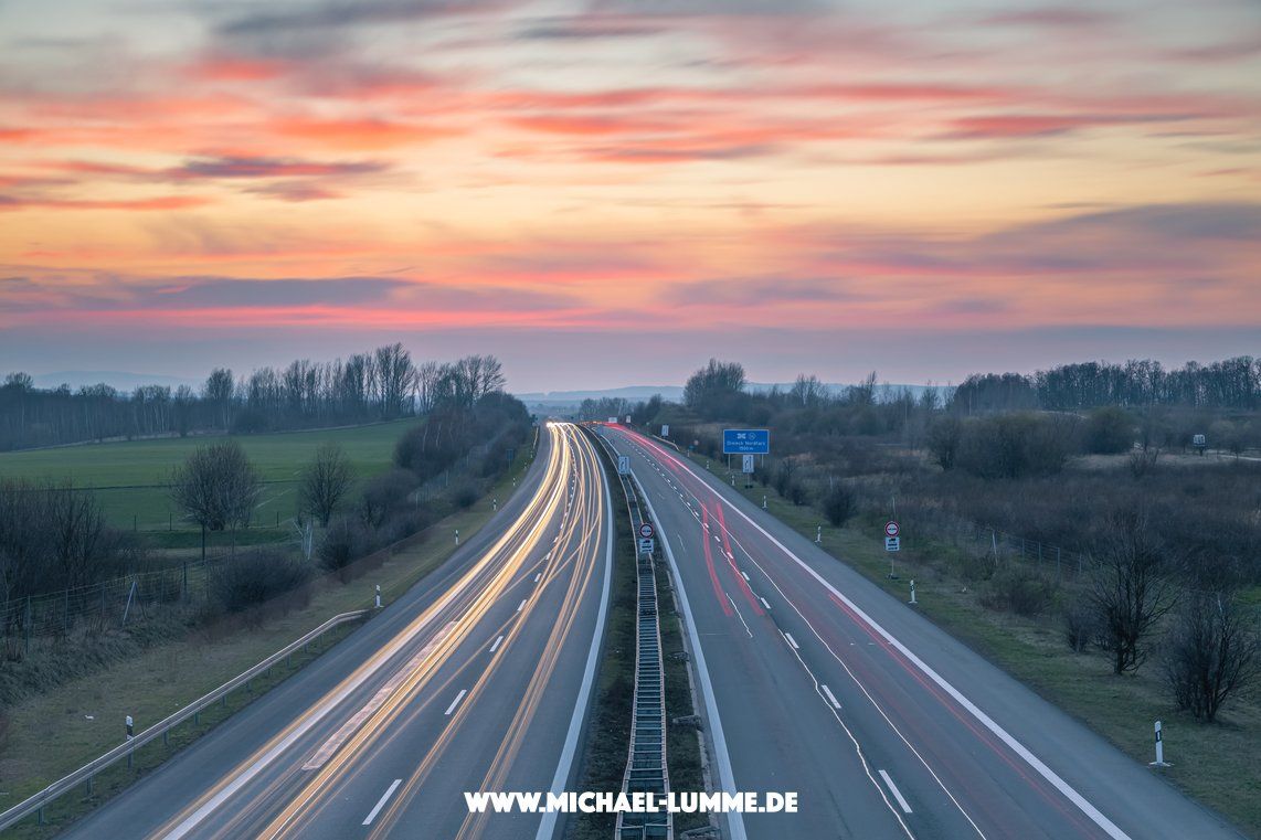 Am Mittwoch des 24. März habe ich einen Spaziergang im Schimmerwald beim Bärlauch unternommen. Auf meinen Rückweg wollte ich den Sonnenuntergang fotografieren. Dazu bin ich nach Abbenrode gefahren und habe an der Brücke am Sandbrink den Sonnenuntergang über der A36 fotografiert. Ich liebe die Stimmung und die Farben bei Sonnenauf- und Sonnenuntergängen sehr, deswegen faszinieren und begeistern sie mich immer wieder. Ich habe mir die A36 für diesen Sonnenuntergang ausgesucht, weil die Sonne über der Autobahn untergehen sollte. Als ich ankam verschwand die Sonne aber leider schon im dichten Dunst. Was blieb war aber ein wunderschönes Abendrot, was ich gerne fotografiert habe. Mit einem ND Filter, einem Neutral Dichte Filter (wie eine Sonnenbrille für das Objektiv) konnte ich Langzeitbelichtungen von der Autobahn machen. Damit verschwanden die PKWs und LKWs von den Bildern und es blieben nur die Lichtspuren.