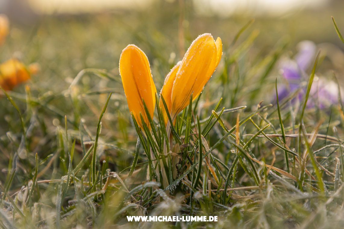 Zum Frühlingsanfang musste ich einfach die Frühblüher die Krokusse im Garten fotografieren. Temperaturen um die minus 4 Grad und der Sonnenaufgang bildeten dabei die perfekte Kulisse. So konnte die aufgehende Frühlingssonne symbolisch gegen den Winter mit seinen minus 4 Grad ankämpfen. Es sah wunderschön aus, wie die Krokusse vom Raureif überzogen waren. Mit dem warmen Sonnenlicht herrschte eine wunderschöne Lichtstimmung, mit der ich die Krokusse in Szene setzen konnte. Dafür liebe ich den Frühling, für seinen Facettenreichtum, überall fängt es an zu blühen und zu summen, die Natur erwacht und neues Leben entsteht. Da ist es jedes Mal eine Freude in die Natur, in den Garten zu gehen und die Natur zu erleben.